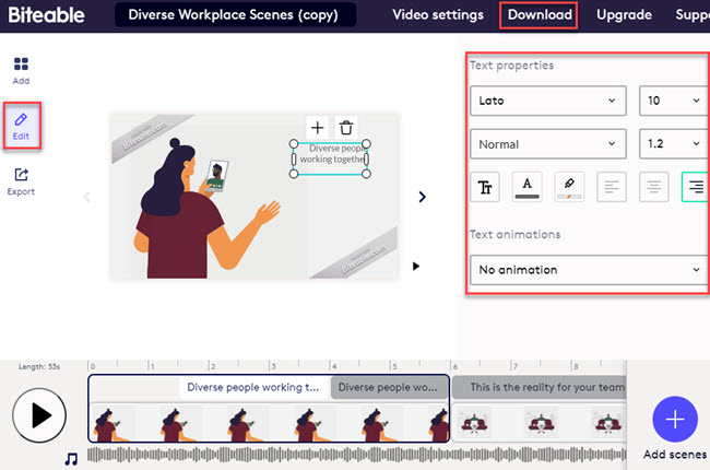 Second, we have Biteable. This is another free video montage maker online that you can use to produce an exciting video for different purposes. Furthermore, you can improve the video montage using royalty-free stock photos, clips, and animations. Another thing that makes this tool awesome is it enables you to upload pictures from the internet directly without downloading the files. Lastly, you can also insert text to the video with different font styles, colors, weights, and sizes. See the steps below on how to customize video montage with Biteable.