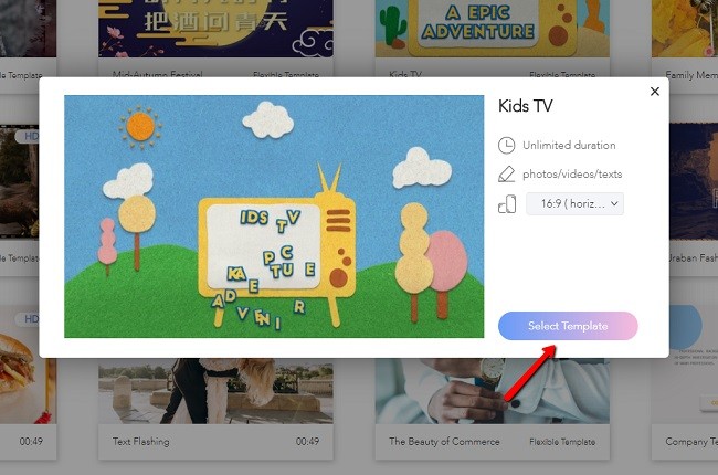 - Next, scroll down the screen and select your desired video template that matches to your needs and then hit the “Select” button.