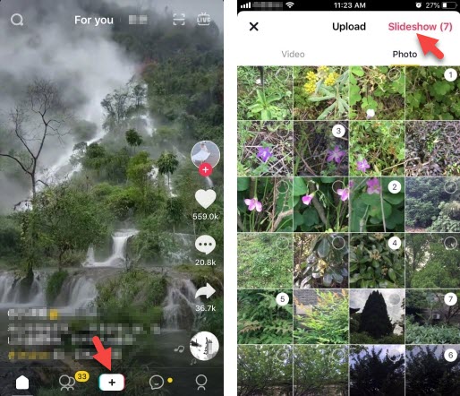 TikTok app is not only for videos, as making a slideshow with this app is also possible. With that, you will not need to use or download another app to create a slideshow. Just open the program and hit the “Add” icon and tap “Upload.” After that, choose images under the Photo tab that you want to use and then tap the “Slideshow” button. Users can easily apply effects and change transitions and background music. Lastly, hit the “Next” button to save it.