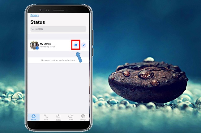 - Then, hit the “Camera” icon at the upper right corner of the screen then press and hold the record button to create a WhatsApp status.