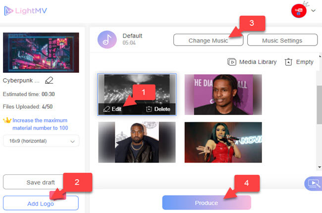 Here, we will introduce one of the best video editors that you can access with the different web browsers named LightMV. Aside from the listed best vocal remover above, we will also show you some tips for making music videos out of photos. One good thing with this is it provides cool templates that can turn photos into cool videos. Furthermore, you can edit the video by inserting text, a personalized watermark, and music of your choice. In addition, you can also share the created music video on Twitter and Facebook directly. Check the steps below to get started.