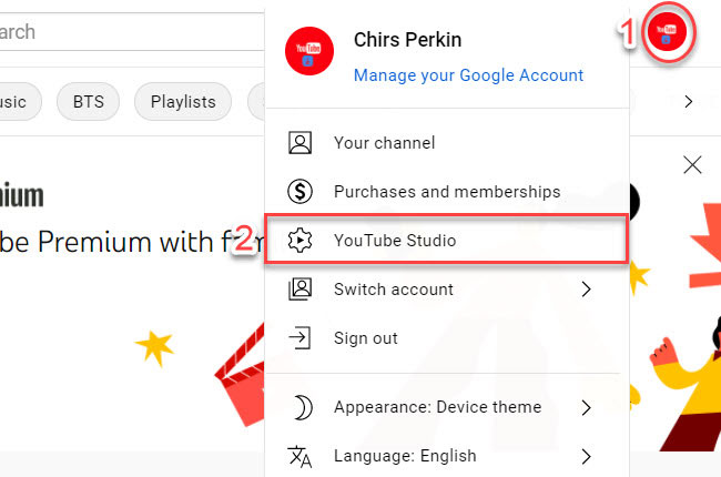 - First, login to your YouTube account and then click the profile icon and go to “YouTube Studio” option.